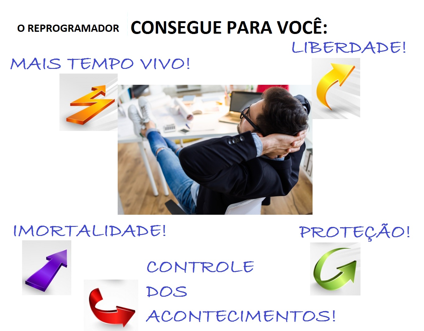 Não é mais necessário viver uma existência sem sentido, dependendo de tudo e de todos, das instituições, sem controle algum de coisa alguma e morrendo, no final (ou no início!) sem sentido algum! Agora, há um conhecimento e uma tecnologia que lhe permitem contatar seu Inconsciente (Interior!) e, assim, controlar tudo em sua vida. Nunca mais ser assaltado, nem atingido pela violência, nem acidentes, nunca adoecer gravemente e, acima de tudo não mais ficar senil, morrendo como um trapo, meio cego, surdo, quase imóvel, só, abandonado, velhinho, numa cama triste. Não! Agora você pode controlar os acontecimentos, as pessoas, a natureza, o tempo, ter todo o dinheiro e amor que quiser, viver como achar de que deva, livre, poderoso! Manter o viço da juventude, mesmo perto do centenário,