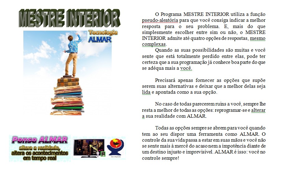 Só que, até agora, ninguém havia criado uma ferramenta que pudesse realizar isso. Assim, Almar® criou o Sistema Almar®, o Reprogramador Pessoal®, a Reprogramação Pessoal®, e outros produtos do sistema.